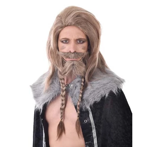 Go back to the Middle Ages with this long brown wig, tash and plaited beard.