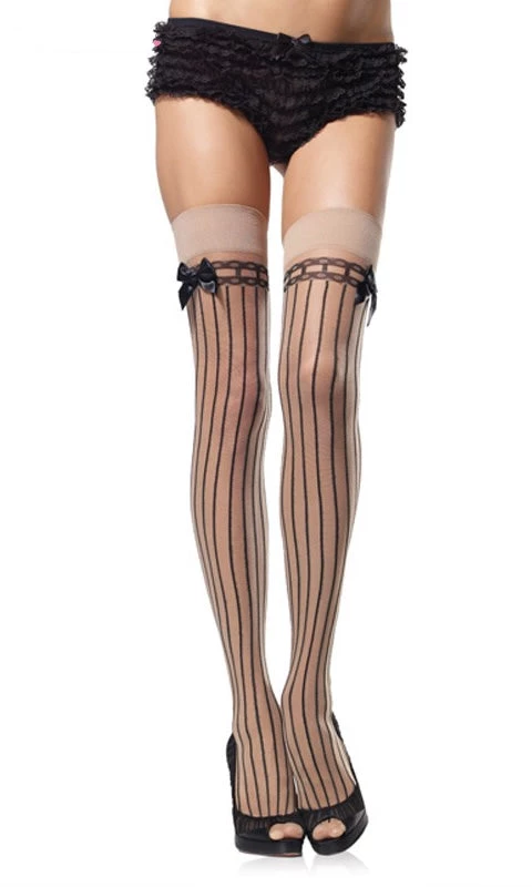 Sheer Stockings with Black Opaque Vertical Stripes and Satin Bow