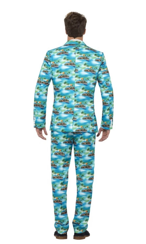 With Hawaii on your mind, think back to when you kicked your feet up and relaxed on the warm sand with the sounds of waves in the background while sipping on a piña colada . Here’s your chance to bring back this calm imagery by putting on this beach water blue suit, which displays mini serene islands with palm trees printed throughout the jacket, trouser, and tie.