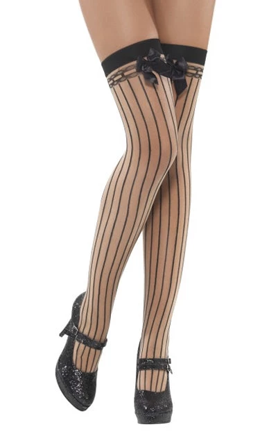 Thigh Hi Stockings, Nude and Black Vertical Stripes and Bow